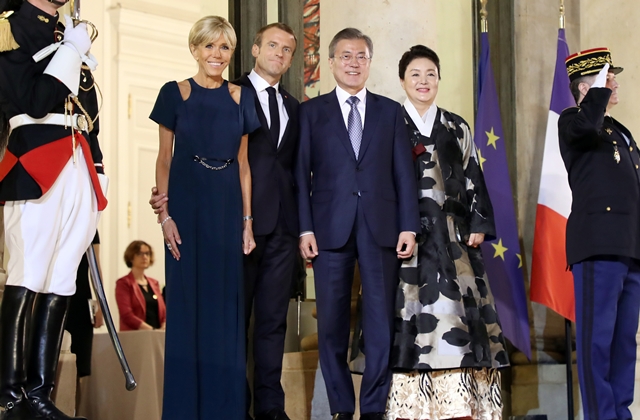 프랑스를 국빈 방문한 문재인 대통령 부부가 에마뉘엘 마크롱 프랑스 대통령 부부와 기념사진을 찍고 있다. 문 대통령은 한-프 정상회담에서 유엔 안전보장이사회의 대북제재 유예·완화를 공식 제안했다. 연합뉴스