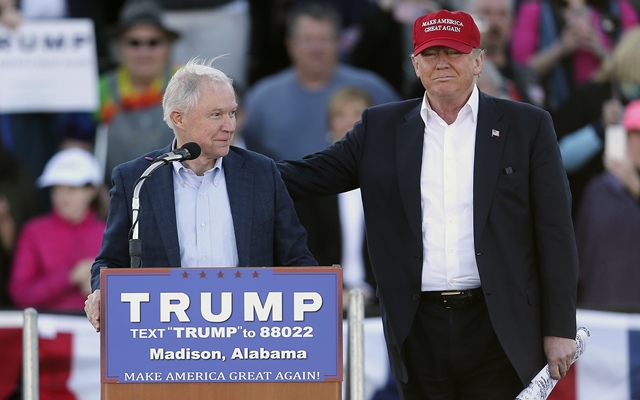 2016년 2월 미국 공화당 대선 후보였던 도널드 트럼프 유세 지원에 나섰을 때의 세션스 전 법무장관(왼쪽) 모습. AP 연합뉴스