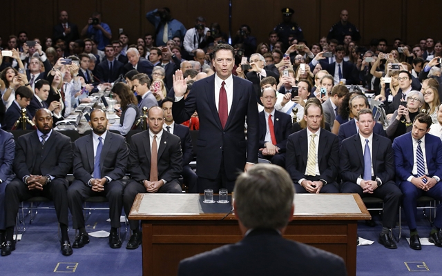제임스 코미 전 연방수사국(FBI) 국장이 지난해 7월 미국 상원 청문회에 출석해 도널드 트럼프 대통령의 ‘러시아 스캔들’ 수사 중단 압력 등에 대해 증언하기 전 선서하고 있다. EPA 연합뉴스