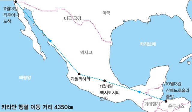 10월27일 카라반 행렬이 멕시코 남부 산페드로타파나테펙을 지나고 있다. AFP 연합뉴스