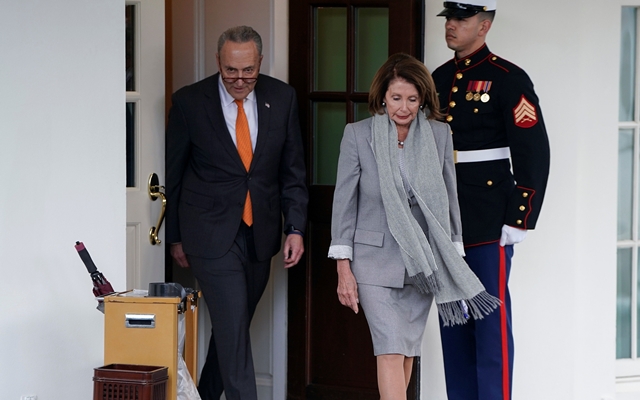 미국 민주당 낸시 펠로시 하원의장(가운데)이 ‘장벽 협상’을 마친 뒤 건물 밖으로 나오고 있다. 민주당이 미국~멕시코 국경지대 장벽 설치에 예산 편성을 반대한 뒤, 각급 기관의 25%가 셧다운됐다. 연합뉴스
