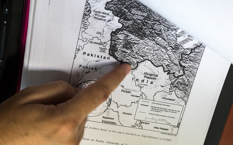 카슈미르 난민 사르다르(가명)가 한국에 오기 전 자신이 살던 곳을 지도에서 가리키고 있다. 박승화 기자