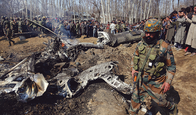 2월27일(현지시각) 인도령 카슈미르 지역에서 인도 군인들과 주민들이 파키스탄 공군이 격추한 인도 공군기의 잔해 주변에 모여 있다. AP 연합뉴스