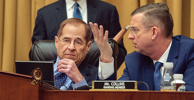 2월8일 미국 워싱턴 국회의사당에서 제럴드 내들러 미국 하원 법사위원장(왼쪽)과 법사위 공화당 간사인 더그 콜린스 하원의원이 나란히 앉아 있다. AP 연합뉴스