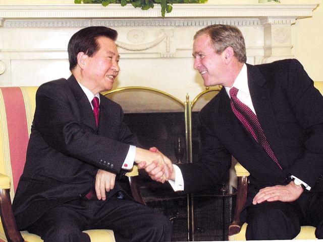 2001년 3월 김대중 전 대통령이 미국 백악관 대통령 집무실에서 조지 W. 부시 대통령과 악수하고 있다. 청와대사진기자단