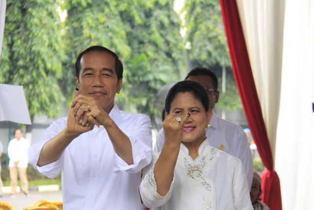 4월17일 인도네시아 대통령선거 투표를 마친 조코 위도도 대통령 부부가 투표 증명으로 손가락에 찍은 잉크를 취재진에게 보여준다.