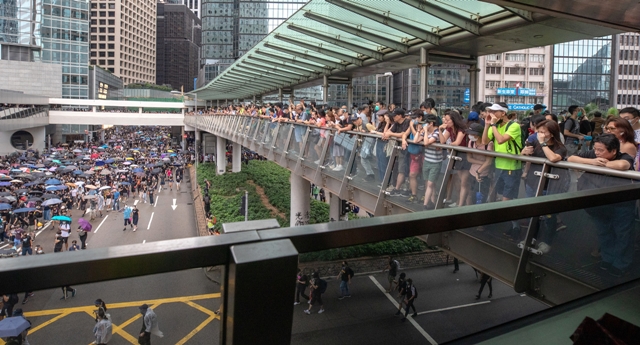 8월31일 홍콩 시내 중심가에서 우산을 들고 행진하는 시위대를 지켜보는 시민들이 건물과 육교 위에서 응원하고 있다. 김진수 기자