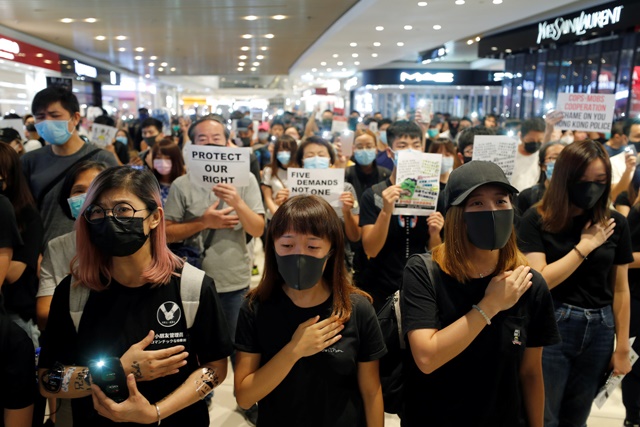 9월21일 홍콩 송환법 반대 시위자들이 위안랑역에서 ‘홍콩에 영광을’을 함께 부르고 있다. 로이터 연합뉴스