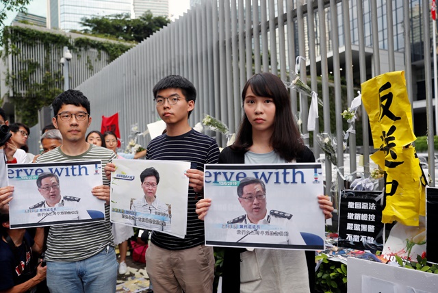 2019년 6월18일 네이선 로, 조슈아 웡, 아그네스 초우(왼쪽부터)가 송환법 반대 팻말을 들고 있다. 로이터 연합뉴스