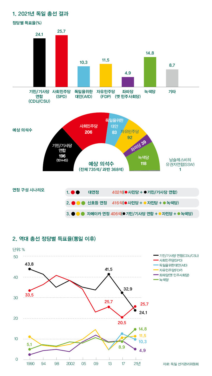 독일은 각 정당의 지역구 후보 투표와 정당 투표를 합산한 총선 득표율에 비례해 의석수가 할당된다. 이에 따라 차기 연방의회에선 전체 735석 중 사민당이 206석, 기민/기사당 연합이 196석, 녹색당이 118석, 자민당이 92석을 확보하게 됐다. 이번 총선에서도 단독 과반 정당이 나오지 않은 까닭에 다수 득표 당이 중심이 된 연정을 구성해야 한다. 대다수 내각제 국가들이 총선 뒤 제1당에 정부를 구성할 우선권을 주는 것과 달리 독일에선 모든 정당에 동등한 기회를 준다. 문제는 주요 정당들의 득표율이 10~20%대로 저조해 압도적 다수당이 없는데다, 양대 정당인 사민당과 기민/기사당 연합 모두가 연정 구성의 주도권을 쥐겠다며 집권 의지를 밝히고 나섰다는 점이다.올라프 숄츠 사민당 대표는 총선 승리가 확인된 직후 “나는 유권자로부터 명백히 연정 구성 임무를 위임받았다”며 “기민/기사당 연합은 (선거 결과에 승복해) 물러나야 한다”고 압박했다. 기민/기사당 연합의 아르민 라셰트 대표는 “항상 최고 득표율 정당에서 총리가 나온 건 아니다. 우리 주도로 연정을 구성하기 위해 최선을 다하겠다”며 물러서지 않겠다는 뜻을 밝혔다. 제2당이 연정 구성에 성공한 전례가 있긴 하다. 1969년 총선이다. 당시 사민당 득표율은 2위였으나 빌리 브란트 대표가 3위를 차지한 자민당과 연정 구성 협상을 성사시키면서 독일연방공화국 수립 이후 20년 만에 처음 집권당이 됐다. 이게 가능했던 것은 사민당이 42.7%라는 높은 득표율을 기록했기 때문이다.2021년 총선에선 사민당과 기민당 모두 득표율이 20%대로 낮은데다 1·2위 격차도 1.6%포인트에 그친다. 이에 따라 연정 구성 셈법도 전례 없이 복잡해졌다. 시나리오는 대연정, 신호등 연정, 자메이카 연정 등 크게 3가지로 압축된다. 대연정은 양대 정당인 기민/기사당 연합과 사민당의 좌우 합작 정부를 말한다. 좌우 합작 정부는 1966년 처음 구성된 이후 한동안 자취를 감췄다가, 앙겔라 메르켈 정부가 출범한 2005년 총선에서 재연됐다. 메르켈 정부 3기(2013년 총선)와 4기(2017년 총선)인 현 정부도 대연정 체제다. 독일 역사에서 3개 정당 연정은 단 한 차례, 그것도 옛 동독에서 전례가 있을 뿐이다. 동·서독 통일 직전인 1990년 3월 동독에서 처음이자 마지막으로 치러진 자유 총선에서 승리한 동독 기민당 연정에 소수정당 독일사회연합(DSU)과 민주궐기당(DW)이 참여했다. 당시 민주궐기당 대변인이 바로 앙겔라 메르켈이다.