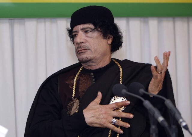 생전에 ’왕 중의 왕’을 자처했던 무아마르 카다피 전 리비아 국가원수가 2009년 2월10일 수도 트리폴리에서 열린 행사에서 연설을 하고 있다. 지난 2011년 그가 권좌에서 축출된 이후 지금껏 리비아에는 전국을 아우르는 중앙정부가 없다. AP 연합뉴스